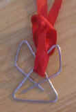 2. Loop the ribbon through the top of the clip as shown in the picture, below. Hold the ends of ribbon together and string both ends through the bead.